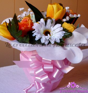 I fiori sono allegri sia per i colori che per il tipo di fiore che hai scelto. L'idea di completare il mazzolino con due regali è strepitosa. Bravissima. Ely