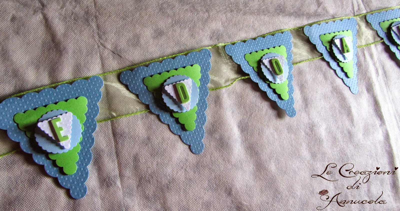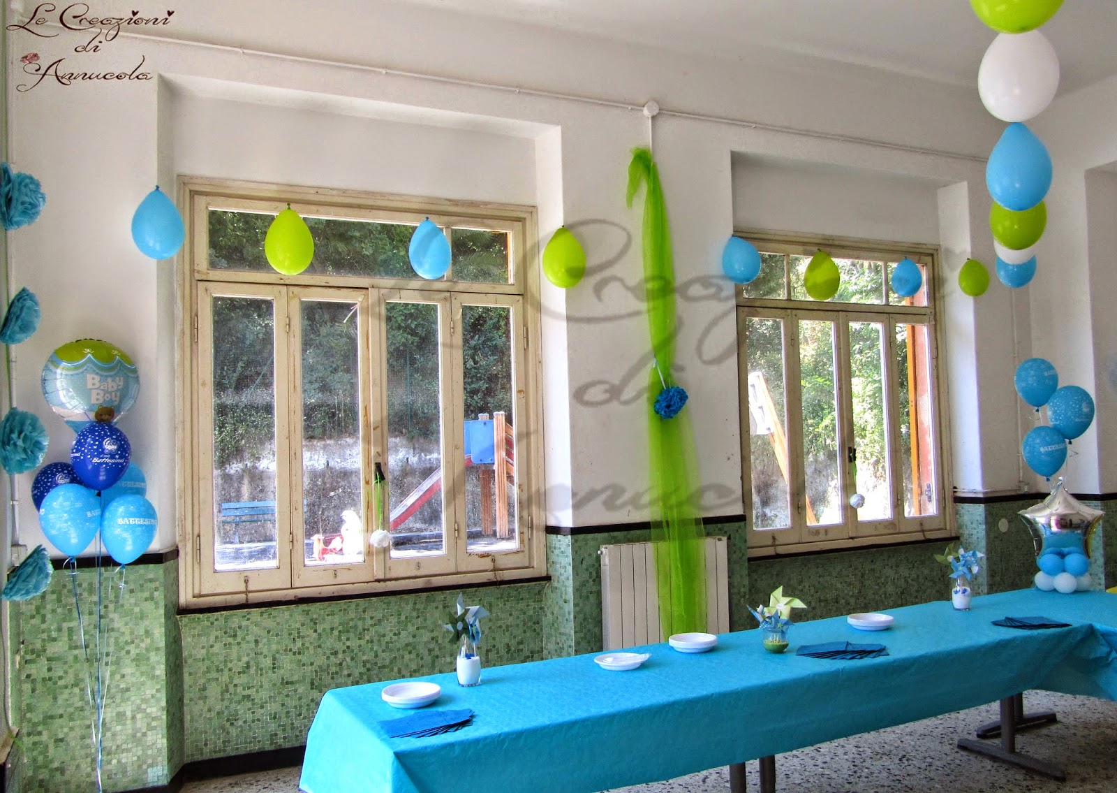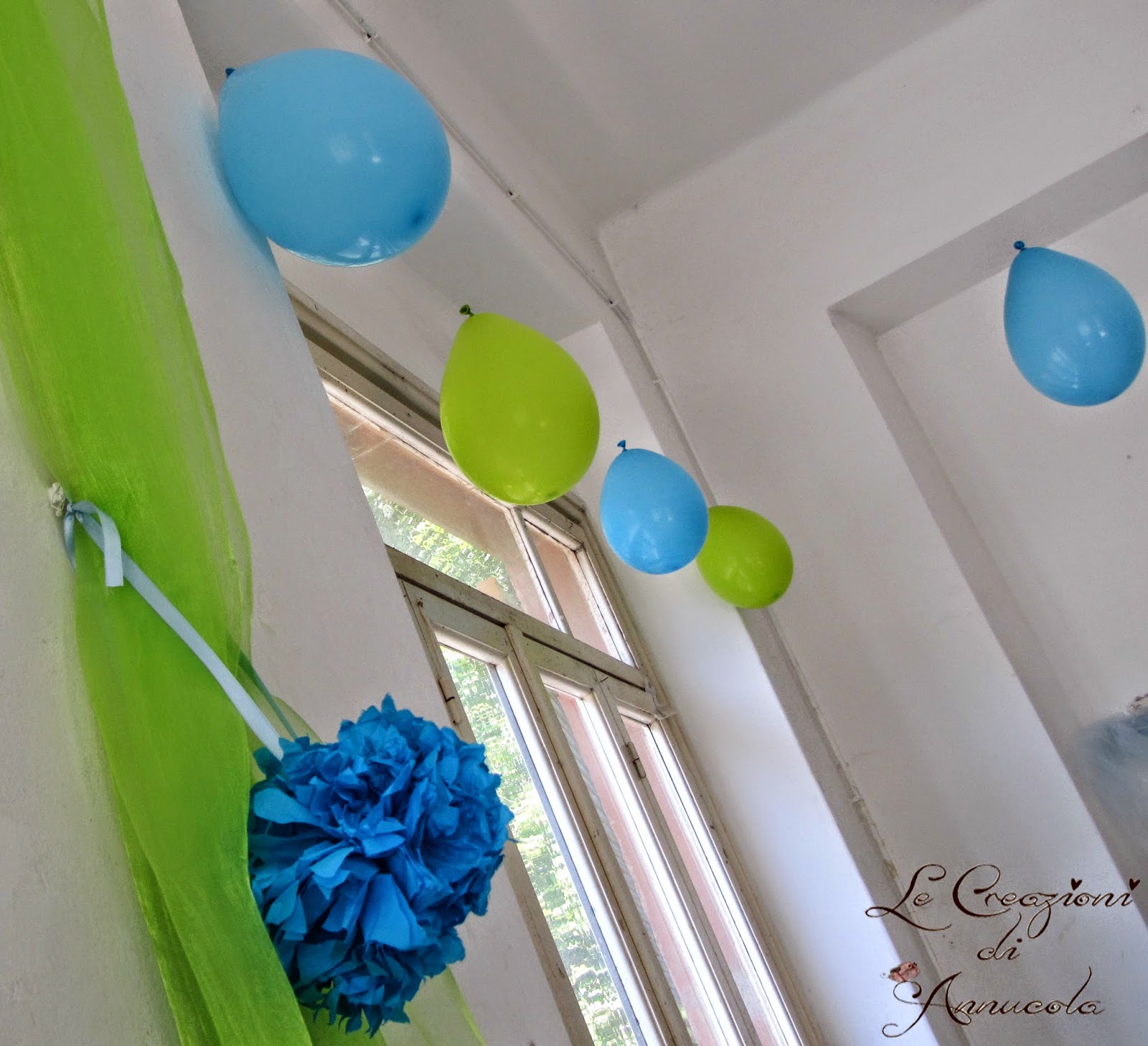 Pon Pon e palloncini dai toni del vede e dell'azzurro